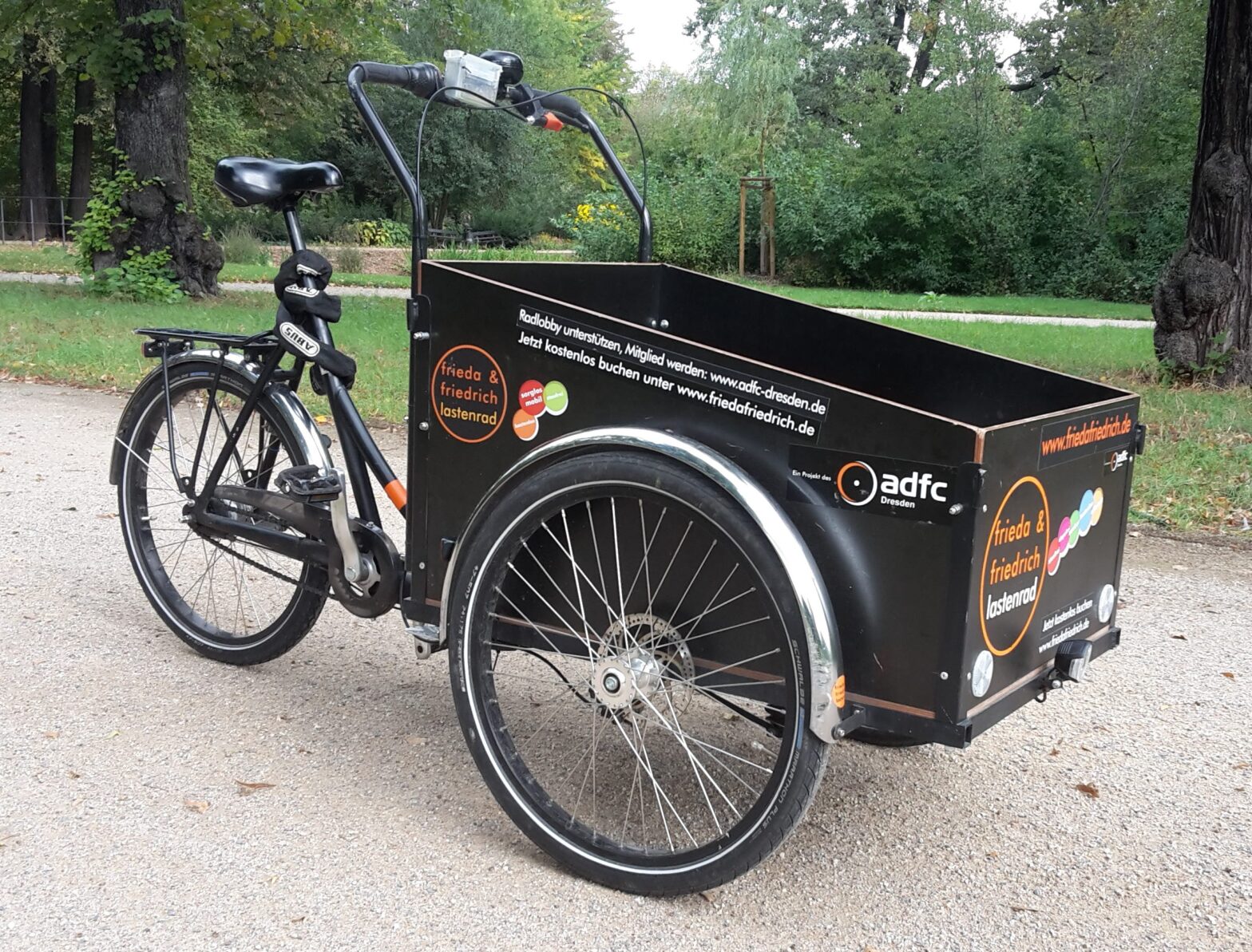 Unsere Frieda ist ein dreirädriges Lastenrad. Sie ist ein leichter und robuster Transporter für Kinder und Lasten. Die maximale Zuladung beträgt 100 kg. Auf dem zusätzlichen Gepäckträger können Fahrradtaschen eingehängt werden. Für Dunkelheit und schlechtes Wetter gibt es Beleuchtung und Schutzbleche.